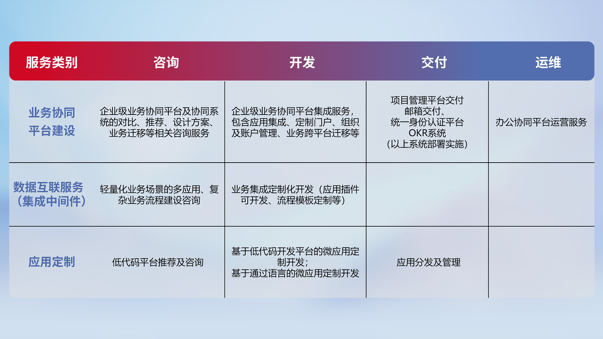 针对钉钉、、、、企微、、、、IDaas等平台级产品提供产品的规划、、、方案、、交付、、、、定制化开发等服务,,,,实现如统一协同办公、、、、智能客户服务、、、、混合会议管理、、智能数据查询、、、、等业务场景,,,实现数字化转型。。。
